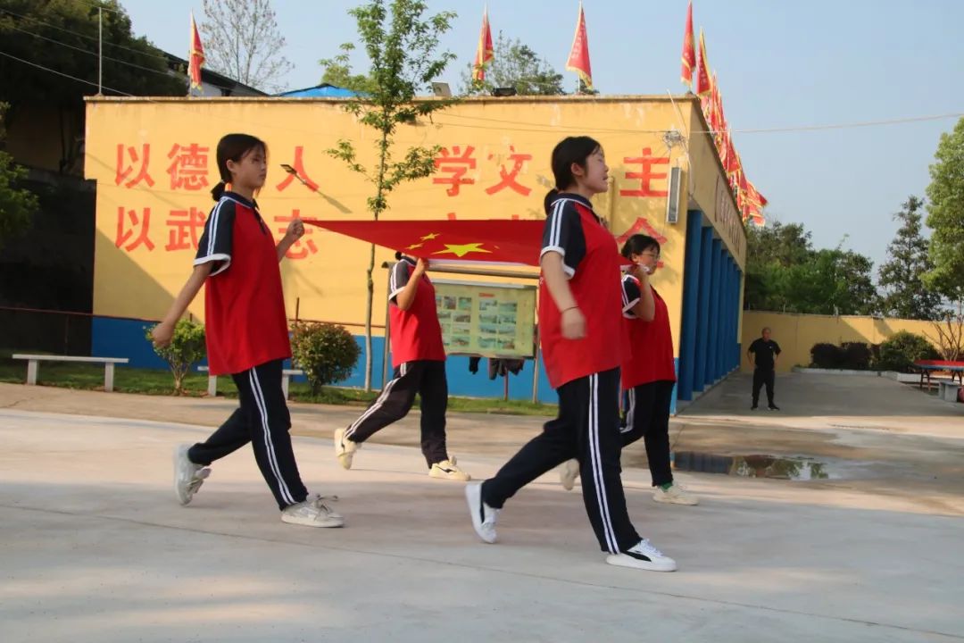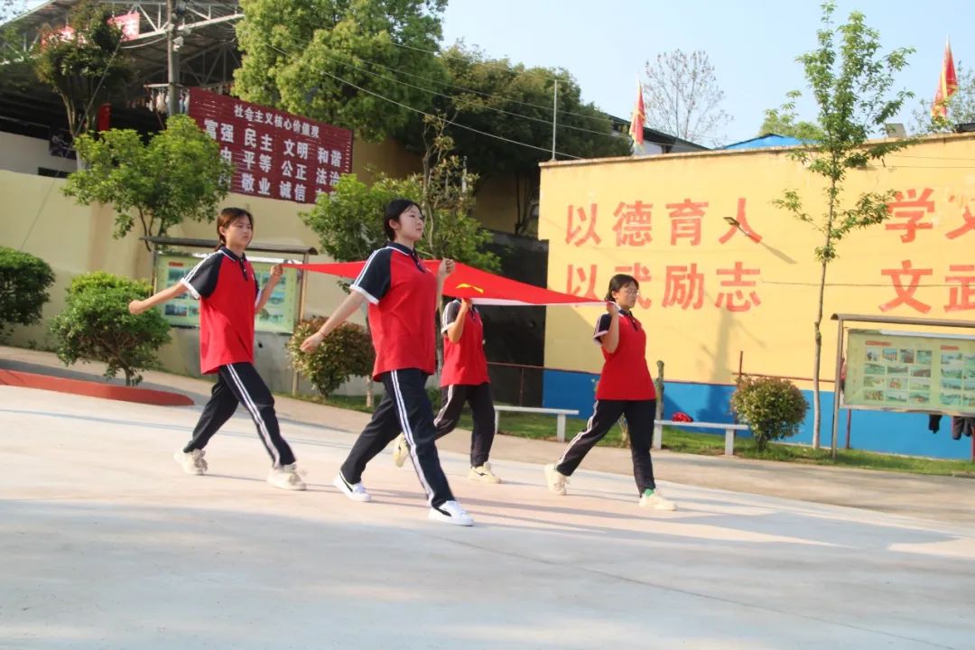升旗儀式的序幕緩緩拉開,四位護旗手肩扛著那面鮮艷的五星紅旗,邁著整齊矯健的步伐,如同四名威武的戰士,護送著國旗走向升旗臺。晨光如金色的紗幔,輕輕灑在少年們的身上,他們挺拔的身姿在晨光中熠熠生輝,每一步都穩重有力,踏地聲仿佛是青春的誓言,在校園的上空回蕩。